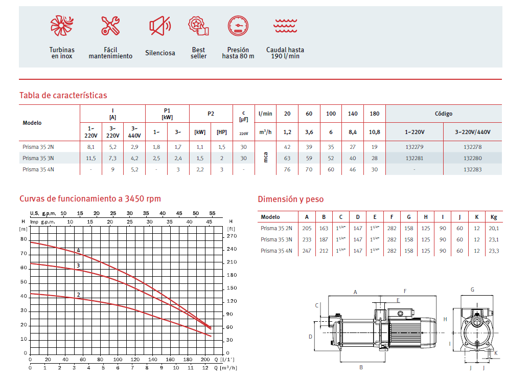 PRISMA 35 2N multi-stage centrifugal pump, 1.5 HP, 220/440V 3F 60 Hz