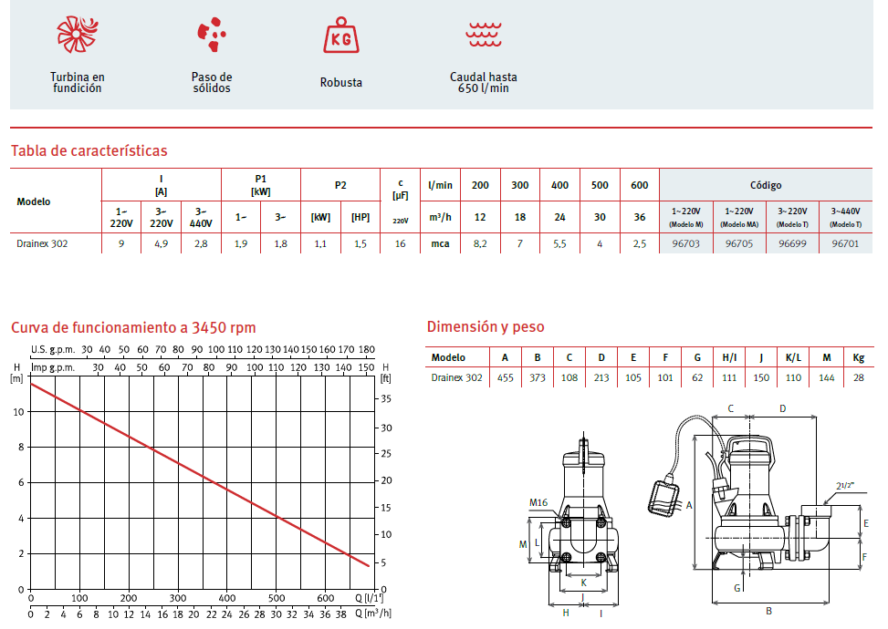 DRAINEX 302 DRAIN PUMP, 1.5 HP, 220 V, 1 F / 96705 - BOES0024