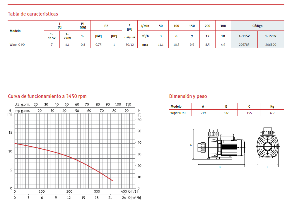 SPA WIPER PUMP 0.90M, 1 HP, 115 V / 206785 - BOES0073
