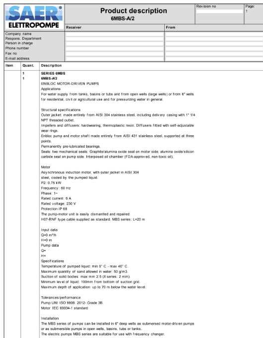 Submersible pump 6MBS A/2, 1 HP, 230V, with float