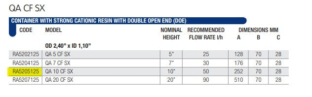 QA CF SX (DOE) STRONG CATION RESIN CARTRIDGES HAVE BEEN DESIGNED TO REDUCE TOTAL WATER HARDNESS AND PRODUCE DISCALIFIED WATER IN SMALL QUANTITIES FOR BOTH DOMESTIC AND TECHNICAL USE.