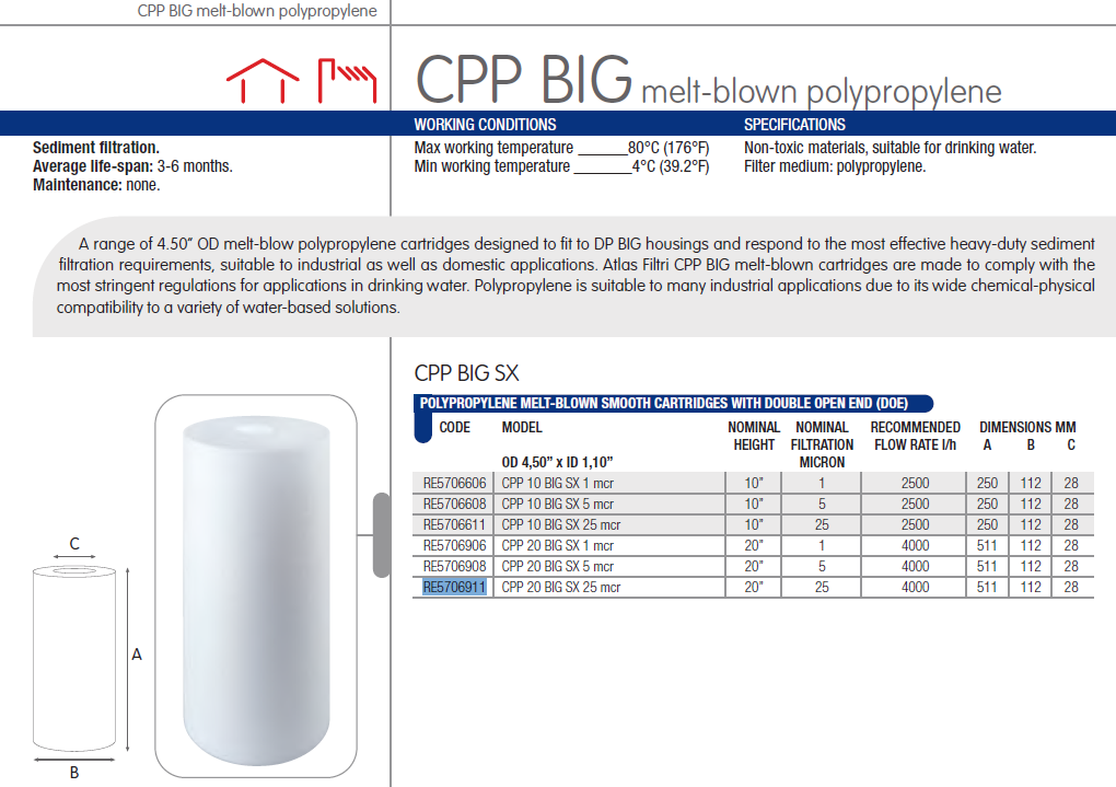 Meltblown CPP Big SX (DOE) depth filtration cartridges made of polypropylene foam offer all the advantages of high-efficiency filtration. Specially designed for DP Big housings.