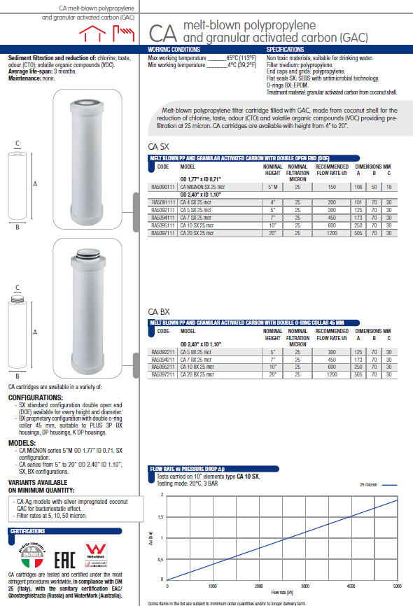 CA SX filter cartridges are available in 2.5”x10” sizes with a nominal filtration of 25 microns and a maximum recommended capacity of 1,200 l/h.