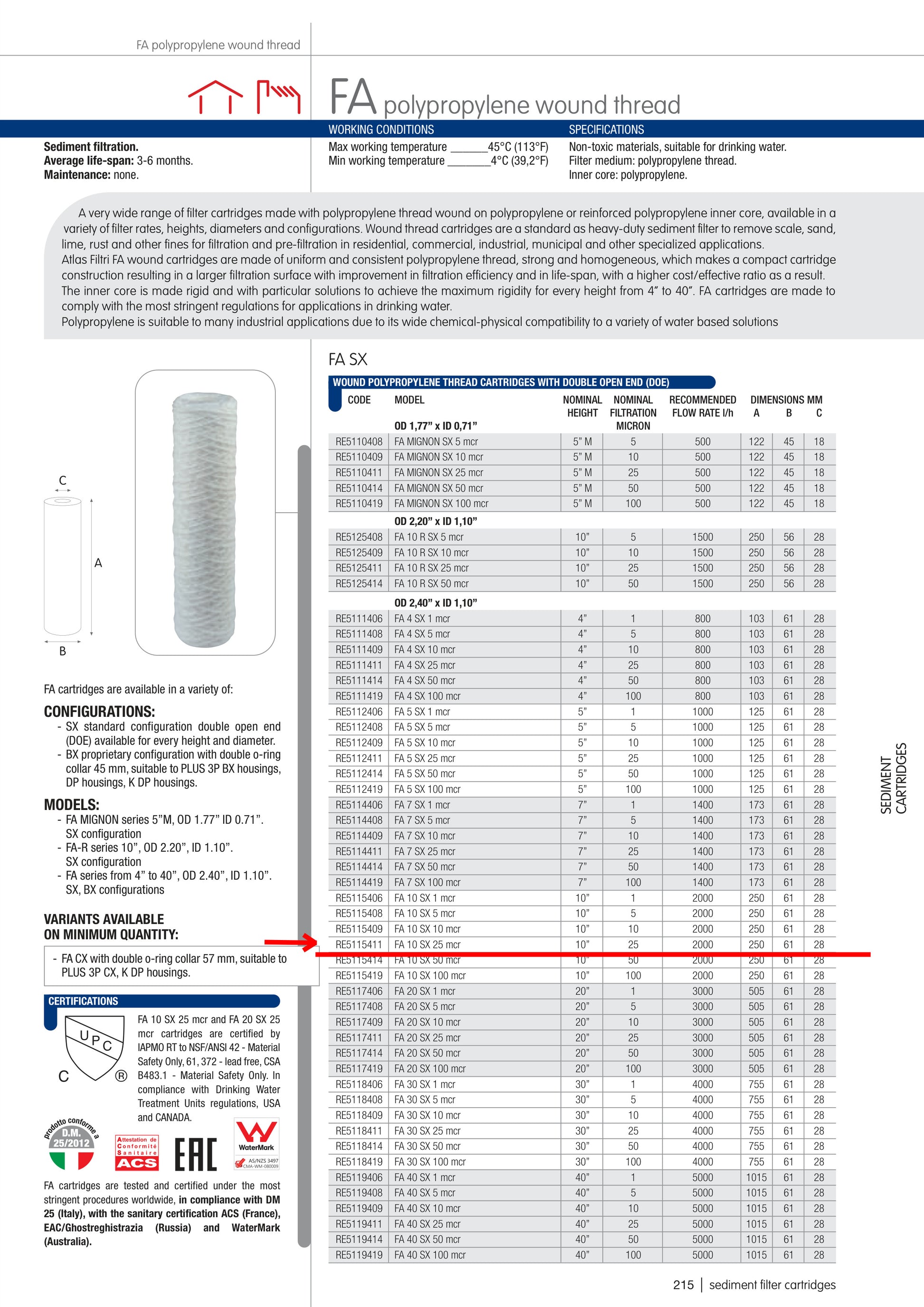 FA 10 SX (DOE) WATER FILTER CARTRIDGES FOR DP HOUSINGS HAVE A 2.5” DIAMETER AND A 10” HEIGHT WITH A NOMINAL FILTRATION OF 5 MICRONS.