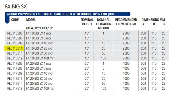 FA 10 BIG SX (DOE) WATER FILTER CARTRIDGES FOR DP BIG HOUSINGS HAVE A 4.5” DIAMETER AND A 10” HEIGHT WITH A NOMINAL FILTRATION OF 25 MICRONS.