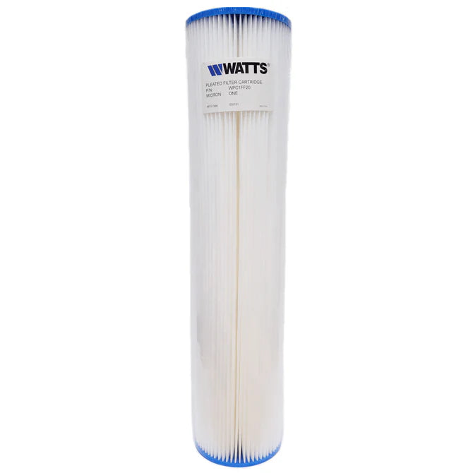Watts WPC1FF20 pleated filter cartridges outperform wound, spun, melt-blown, resin-bonded, and other "depth" style filter elements because our pleated cartridges provide greater surface area, lower pressure drop, and longer filter life. Our 100% synthetic media is washable and cleanable, five microns and up, to reduce filtration costs. Standard features of Watts brand pleated filters.
