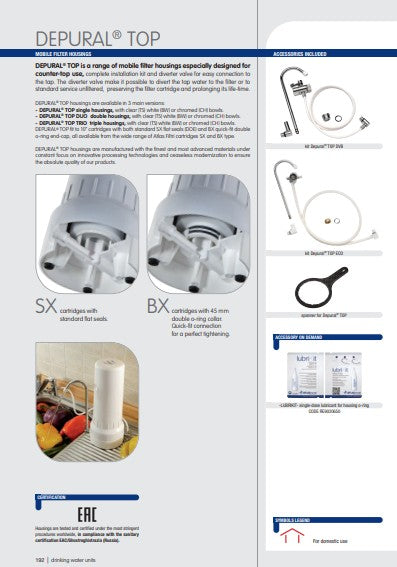 DEPURAL TOP SX (DOE) 10" high faucet filter cartridges are designed to remove impurities, unpleasant odors and flavors, and chemical contaminants as needed. They are equipped with a bypass diverter valve and guarantee the use of both filtered and unfiltered water, promoting a sustainable policy and achieving concrete savings.