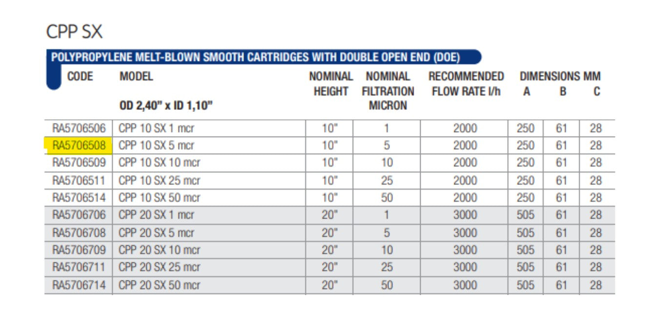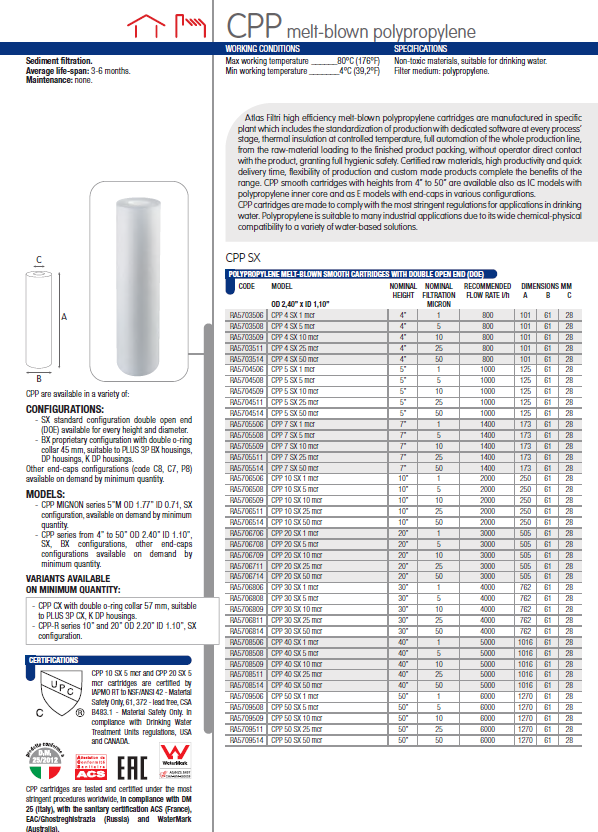 LOS CARTUCHOS PARA FILTRACIÓN DE PROFUNDIDAD MELTBLOWN CPP SX (DOE) DE ESPUMA DE POLIPROPILENO OFRECEN TODAS LAS VENTAJAS PARAUNA FILTRACIÓN DE ELEVADA EFICIENCIA.